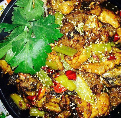 2.鍋中油7成熱,放入花椒大料,然后再將蔥,姜放入油鍋內(nèi)爆香后放入魚塊以及干鍋魚調(diào)料翻炒!